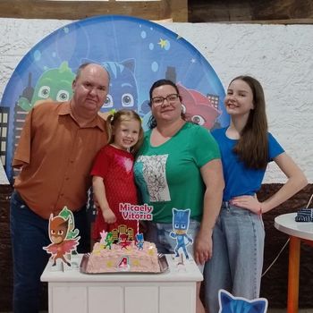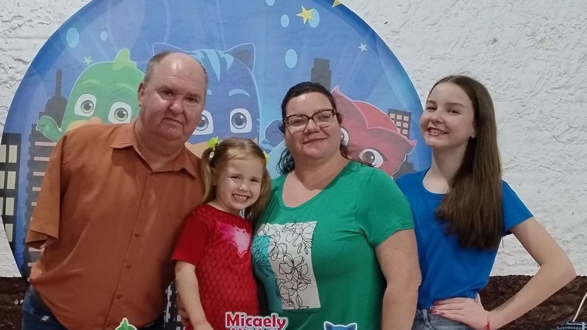 O casal construiu família e negócios. Hoje, com as filhas e uma pequena empresa em casa, produzem estampas em camisetas, canecas e peças em MDF com máquina a laser. “Eu desenho, a Catiane corta e monta. Assim nos sustentamos, porque o benefício do INSS não dá para manter uma família.”